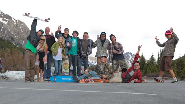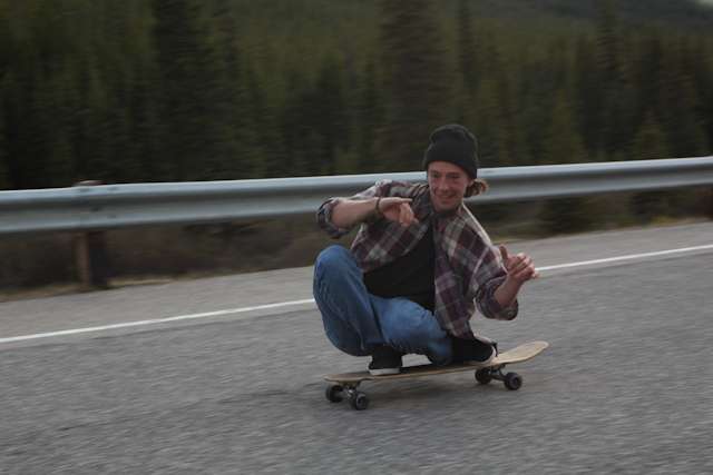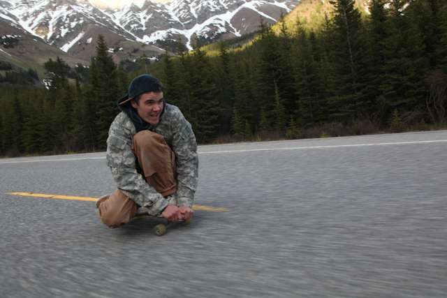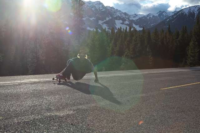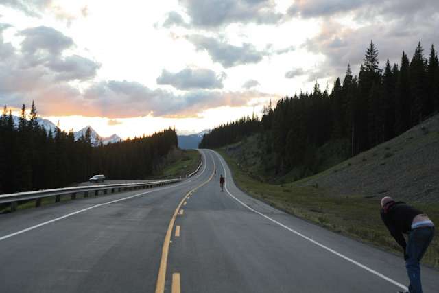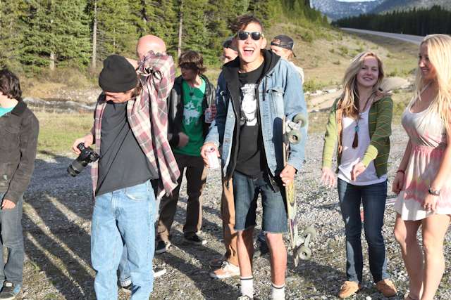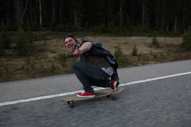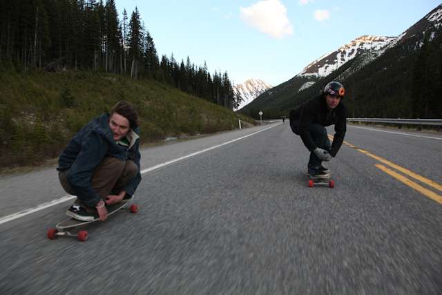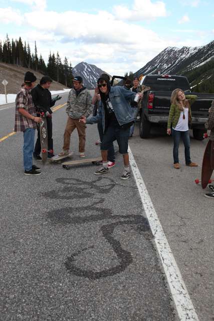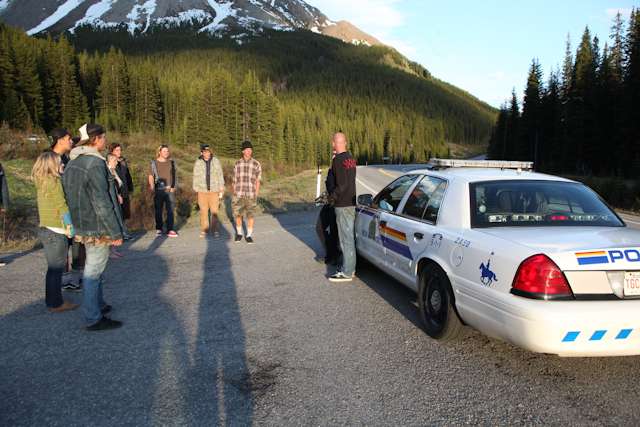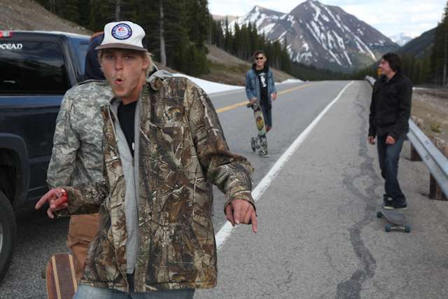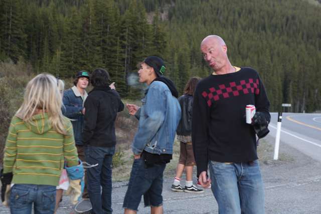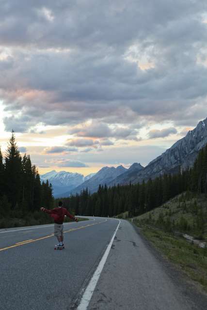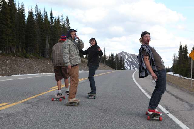 did the highwood. 9th annual? 10th? 7th? who knows, but this one was pretty great. last year we got rained out a bit, still went for one bomb which was slow, then saw hank 3 in the city. fine fine. this time it was perfect. weather was great, crew was too, and took place on the solstice! MOONFISH!! we did the south side twice, the north once, when the sun was going down. was quite beautiful really. saw a grizzly, some elk, deer and one cranky hag that tried real hard to let us know that what we were doing was “ILLEGAL!!!” . when your maybe 65km/hr on a tiny piece of wood trying not to peel your face on the pavement its really only the lip reading that makes any sense, no sounds from those judging lips. apparently the hag was dedicated about this, and at the bottom of the north side we were treated to a visit by one of k countries finest, and she sniffed out the booze likkety split. dang! actually was one of the more civil encounters with the fuzz ive been through in my time, and after a few booze tikkies, she gladly posed with us for our annual highwood sk8 photo, as long as there were no rude gestures(see photo for proof). we did not get any tiks for the actually skating, only the booze, so soon as she split, we bombed the rest of the north side, and got a great view of the sunset on the first day of summer. quite a great time. blah blah blah, heres the photos.