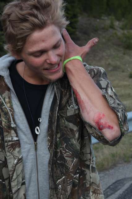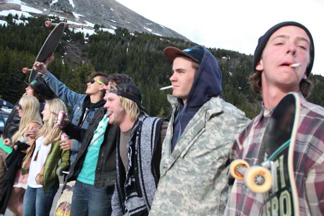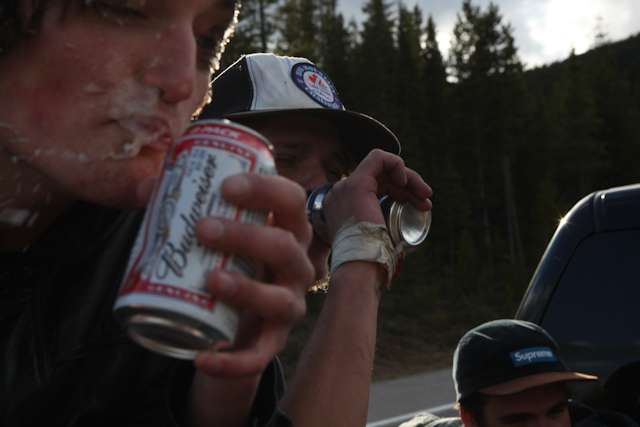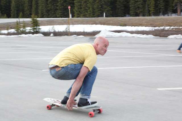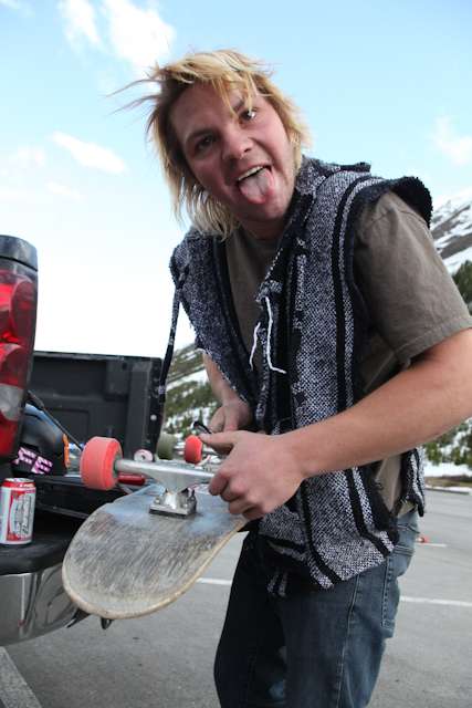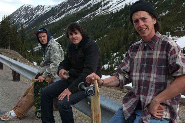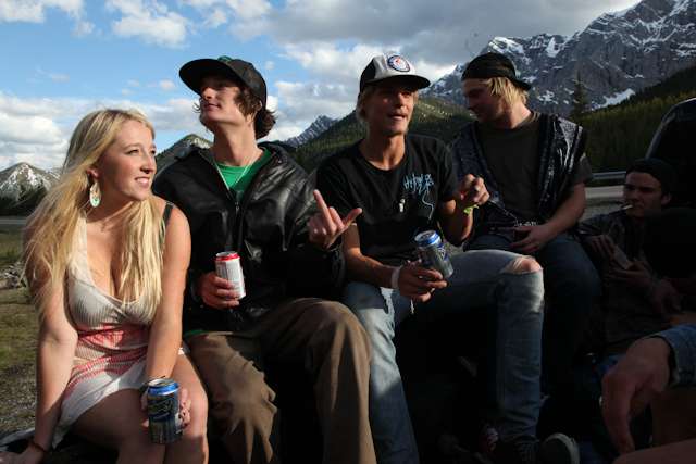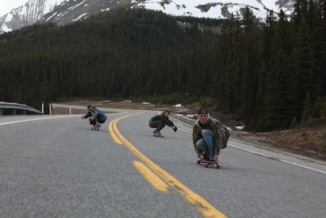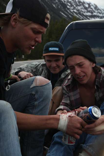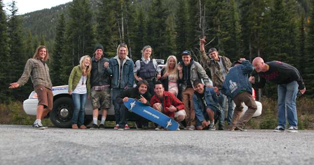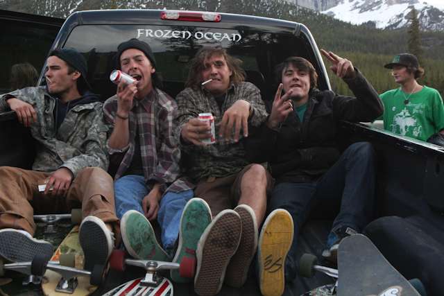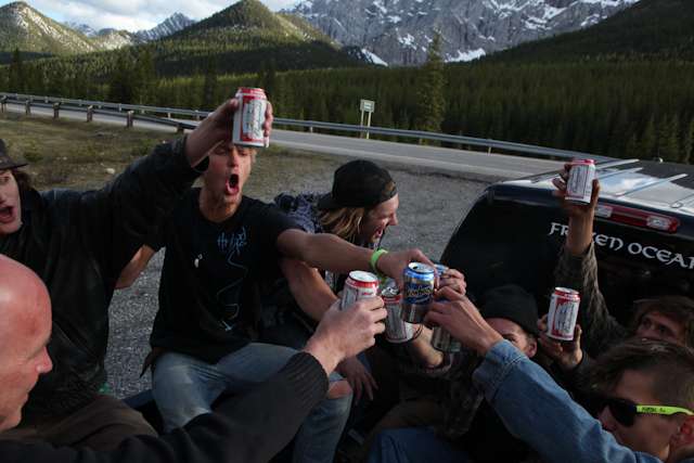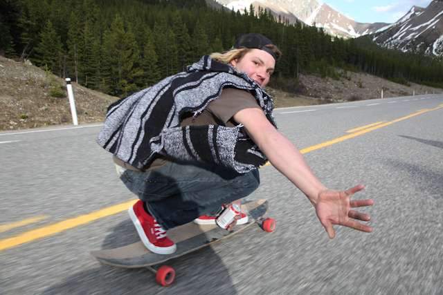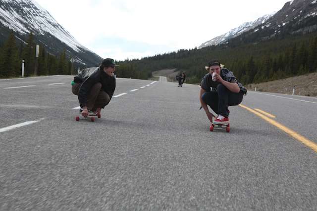 did the highwood. 9th annual? 10th? 7th? who knows, but this one was pretty great. last year we got rained out a bit, still went for one bomb which was slow, then saw hank 3 in the city. fine fine. this time it was perfect. weather was great, crew was too, and took place on the solstice! MOONFISH!! we did the south side twice, the north once, when the sun was going down. was quite beautiful really. saw a grizzly, some elk, deer and one cranky hag that tried real hard to let us know that what we were doing was “ILLEGAL!!!” . when your maybe 65km/hr on a tiny piece of wood trying not to peel your face on the pavement its really only the lip reading that makes any sense, no sounds from those judging lips. apparently the hag was dedicated about this, and at the bottom of the north side we were treated to a visit by one of k countries finest, and she sniffed out the booze likkety split. dang! actually was one of the more civil encounters with the fuzz ive been through in my time, and after a few booze tikkies, she gladly posed with us for our annual highwood sk8 photo, as long as there were no rude gestures(see photo for proof). we did not get any tiks for the actually skating, only the booze, so soon as she split, we bombed the rest of the north side, and got a great view of the sunset on the first day of summer. quite a great time. blah blah blah, heres the photos.